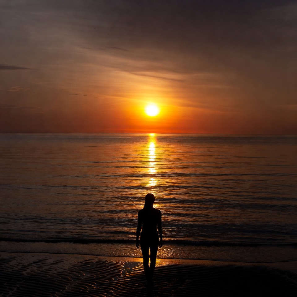 A woman's silhouette stands on the beach facing the ocean during sunset. The bright orange sun hovers above the horizon, reflecting golden light on the calm water. Wet sand and gentle waves surround her feet.