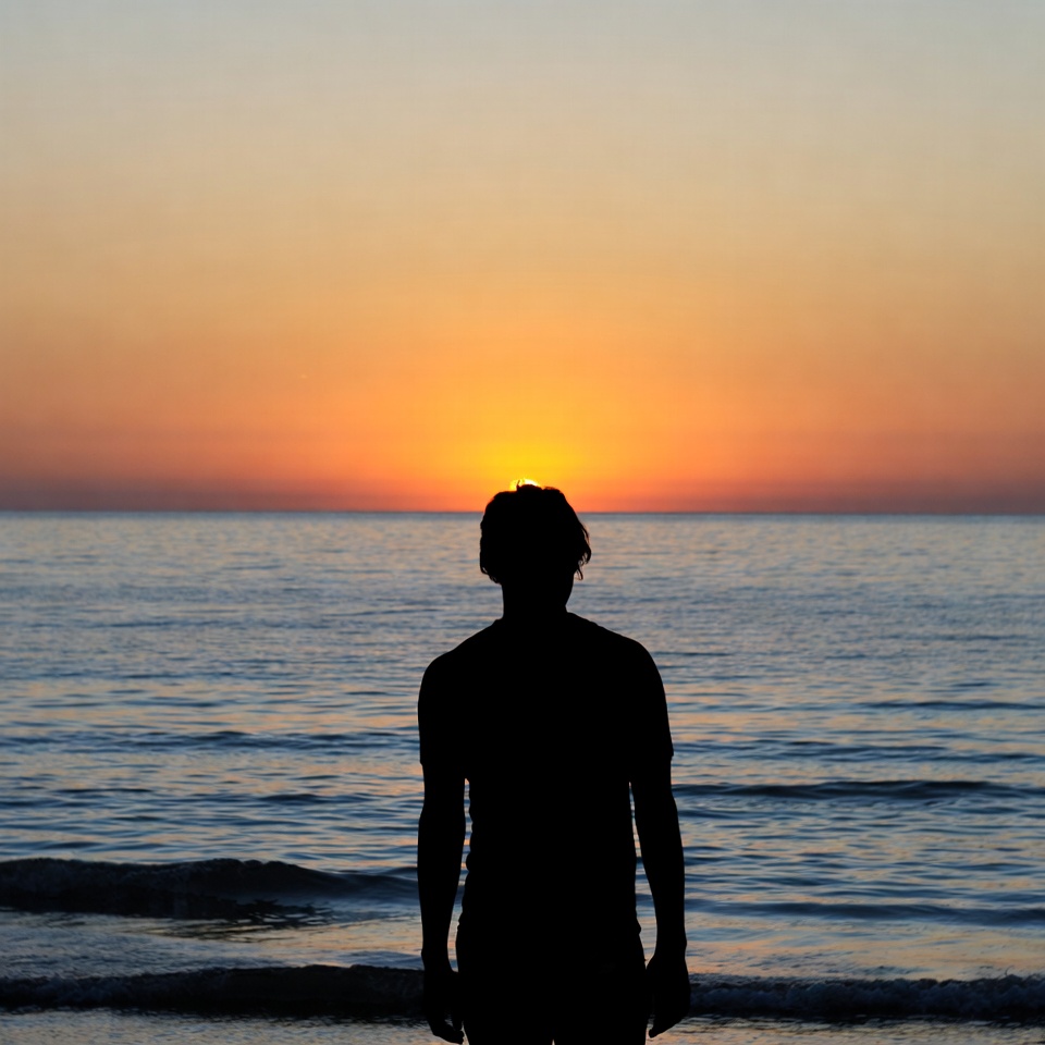 A silhouette of a man stands facing the ocean with arms at his sides as the sun sets on the horizon. The sky transitions from deep blue to vibrant orange above calm waves lapping at the shore. He wears a shirt and has hair visible in the backlit outline.
