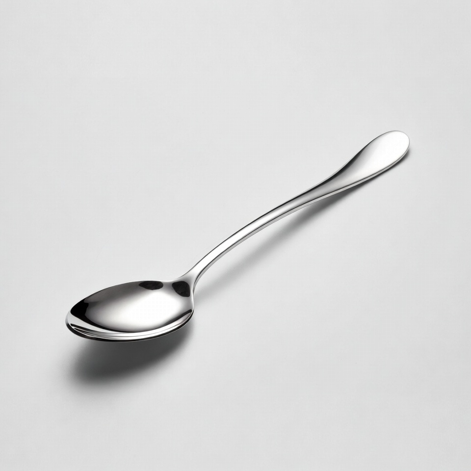 A polished silver spoon lies flat on a plain white surface. The spoon features a smooth, oval bowl and a slender, elegant handle. Subtle shadows highlight its metallic sheen and contours.