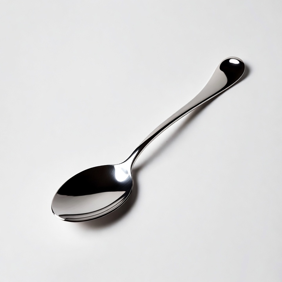 cutlery, eating utensil, isolated background, kitchen utensil, metal spoon, oval bowl, polished metal, shiny spoon, silver spoon, slender handle, tableware, white background, spoon