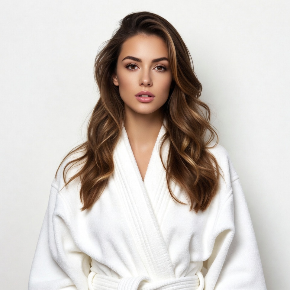 A young woman with long wavy brown hair stands against a white background wearing a white bathrobe. She has a subtle smile and direct gaze at the camera. The bathrobe features a V-neck and belt tied at the waist.