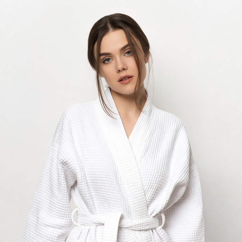 A young woman with brown hair in a bun stands against a white background wearing a white terry cloth bathrobe. She has a slight smile and gazes directly at the camera. The bathrobe features a V-neckline and is tied with a matching belt.