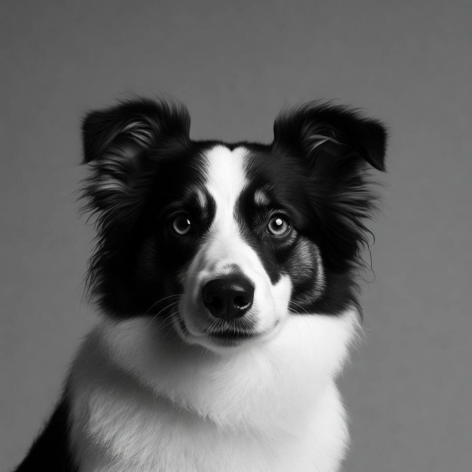 A black and white Border Collie dog stares directly at the camera with bright blue eyes. Its fluffy fur features distinct black patches on a white face and chest. The dog is centered against a plain gray background.