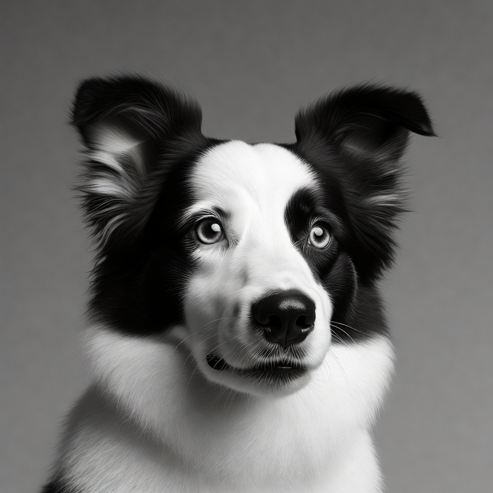 A black and white Border Collie dog faces forward with perked ears and alert blue eyes. Its fluffy fur features distinct black patches over a white face and chest. The detailed portrait is set against a plain gray background.