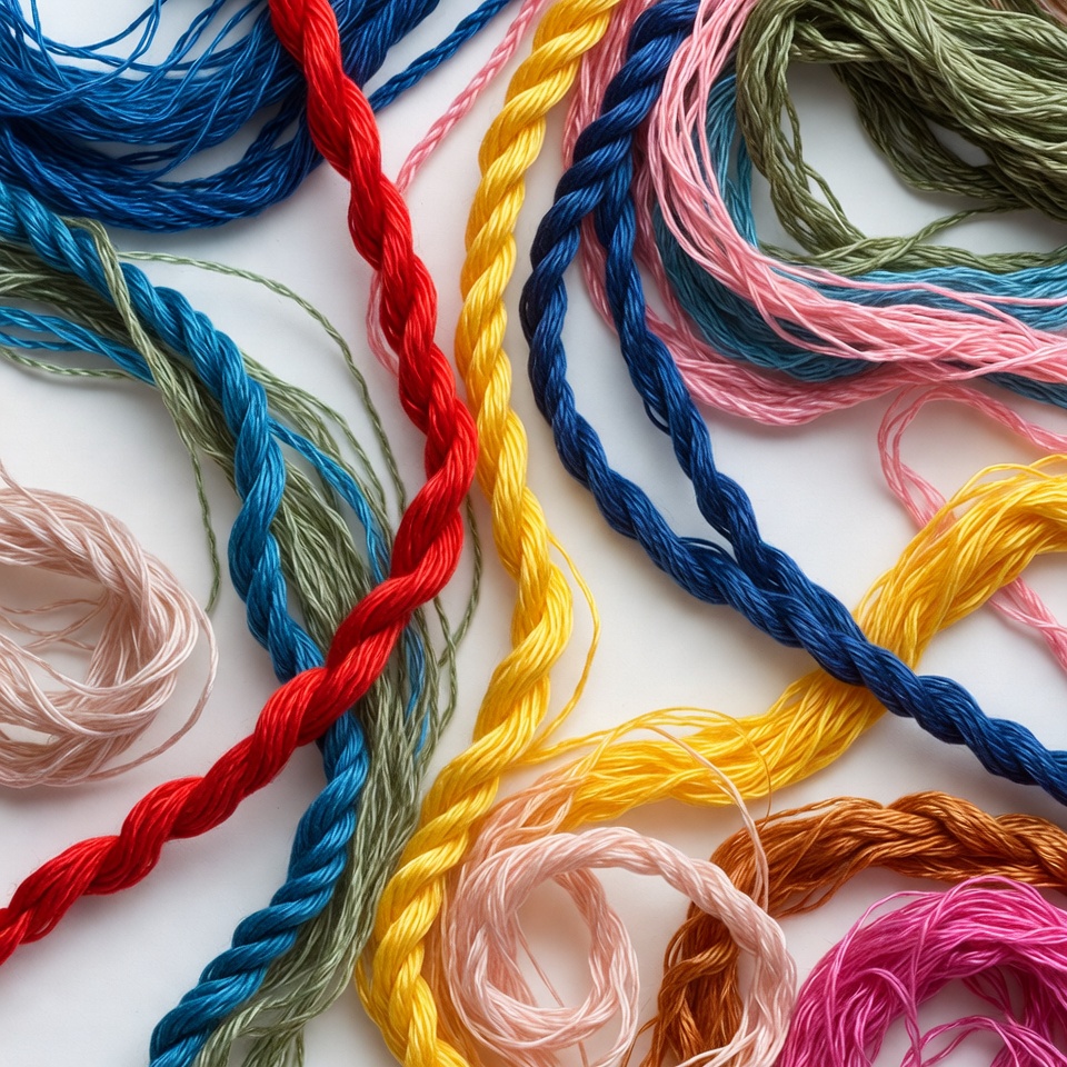 A collection of colorful embroidery floss threads in red, blue, yellow, pink, green, and other shades is tangled and arranged across a plain white surface. The threads form twisted loops and strands, showcasing a vibrant assortment of hues. No people or other objects are present.