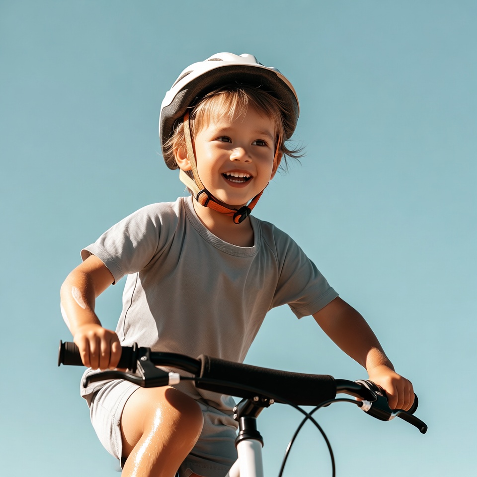 A young boy with light brown hair smiles happily while riding a white bicycle outdoors against a clear blue sky. He wears a white helmet, gray short-sleeve shirt, and matching shorts. His hands grip the black handlebars firmly as he pedals.