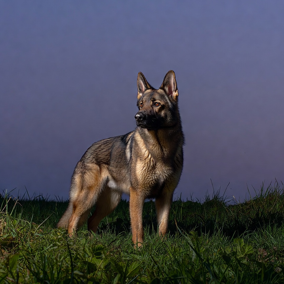 A German Shepherd dog stands alert on a grassy field with a purple sky background. The dog has a black and tan coat, pointed ears, and a focused expression. Its fur is detailed with shades of gray, brown, and black.