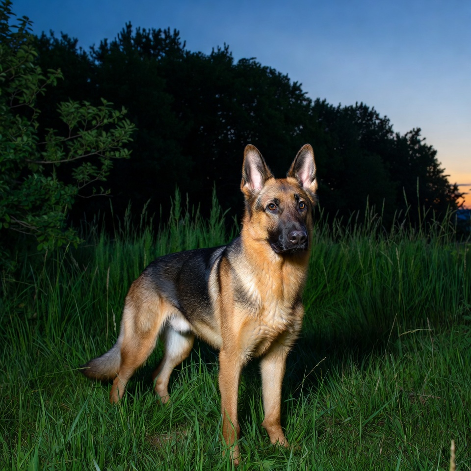 alert dog, animals, black tan fur, breed, canine, dog, dusk, evening, forest, grass, night, outdoor, pet, shepherd dog, standing, sunset, tall grass, trees, German Shepherd