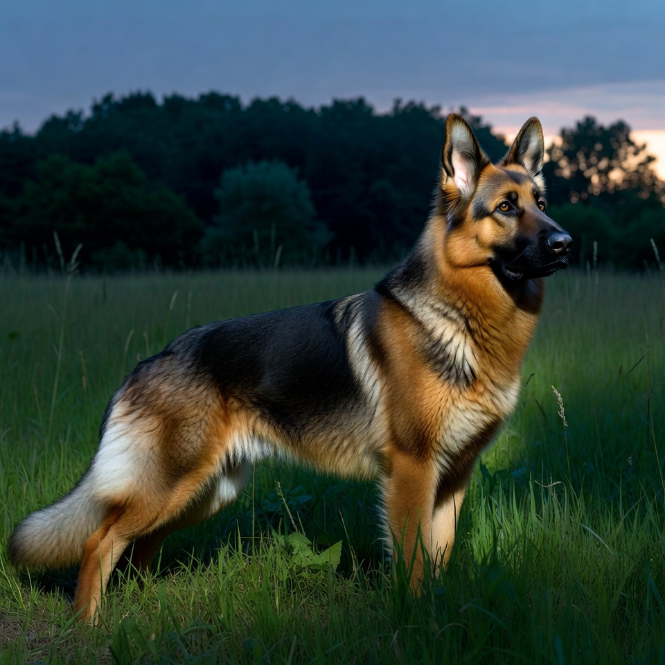 A majestic German Shepherd dog stands alert in a grassy field with tall grass surrounding its paws. The dog's black and tan coat is highlighted against a sunset sky with dark green trees in the background. Its ears are perked up and it gazes forward intently.