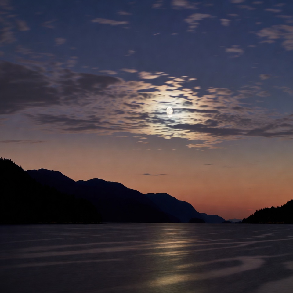 calm water, clouds, dusk, forested mountains, full moon, horizon, lake, landscape, lunar, mountains, nature, night sky, outdoors, peaceful landscape, reflection, scenery, silhouette, twilight, water, moon