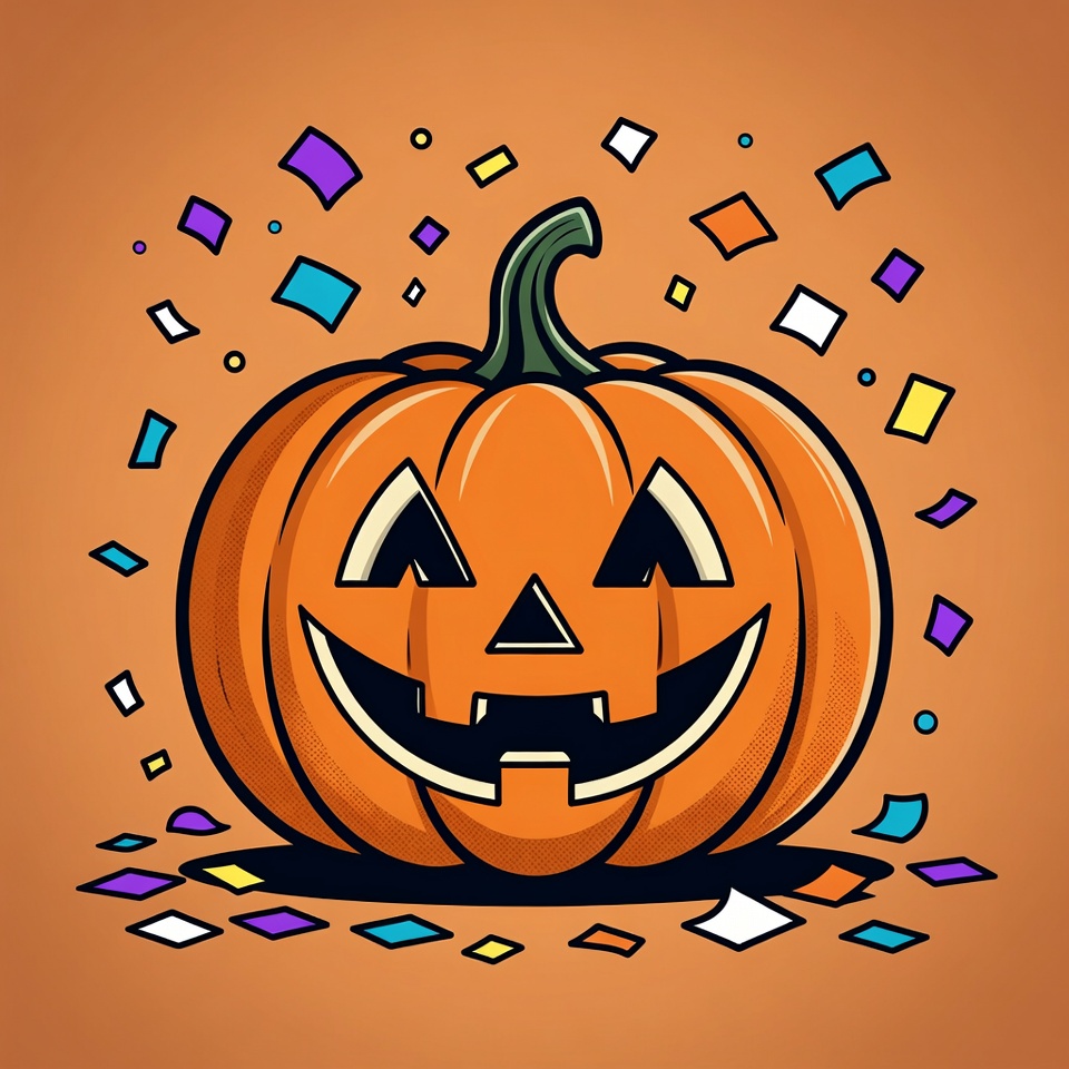A cartoon jack-o-lantern pumpkin with a wide grinning face and sharp teeth sits on a warm orange background. Colorful confetti in purple, yellow, blue, and other hues scatters around it. The illustration features bold outlines and a festive Halloween theme.