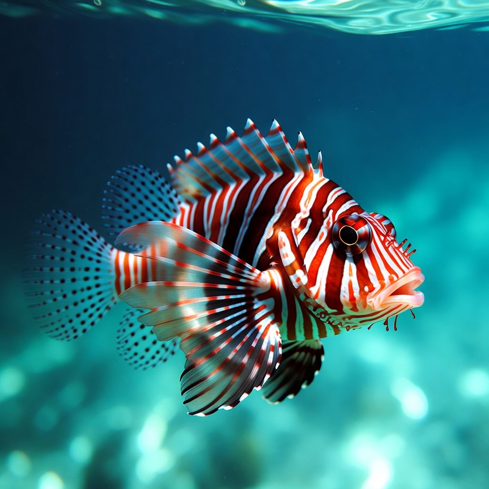 aquarium fish, aquatic animal, blue water, coral reef, exotic fish, fish fins, lion fish, marine life, ocean, red fish, red white stripes, saltwater fish, sea creature, spiny fish, striped fish, swimming fish, tropical fish, underwater, venomous fish, lionfish