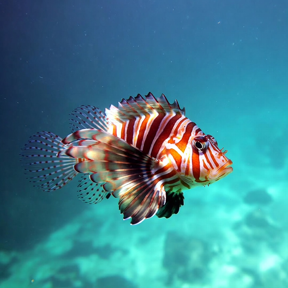 aquarium fish, aquatic animal, blue water, coral reef, fish, lion fish, marine life, ocean, pectoral fins, red stripes, sandy bottom, sea creature, striped fish, swimming, tropical fish, underwater, venomous spines, white stripes, wildlife, lionfish