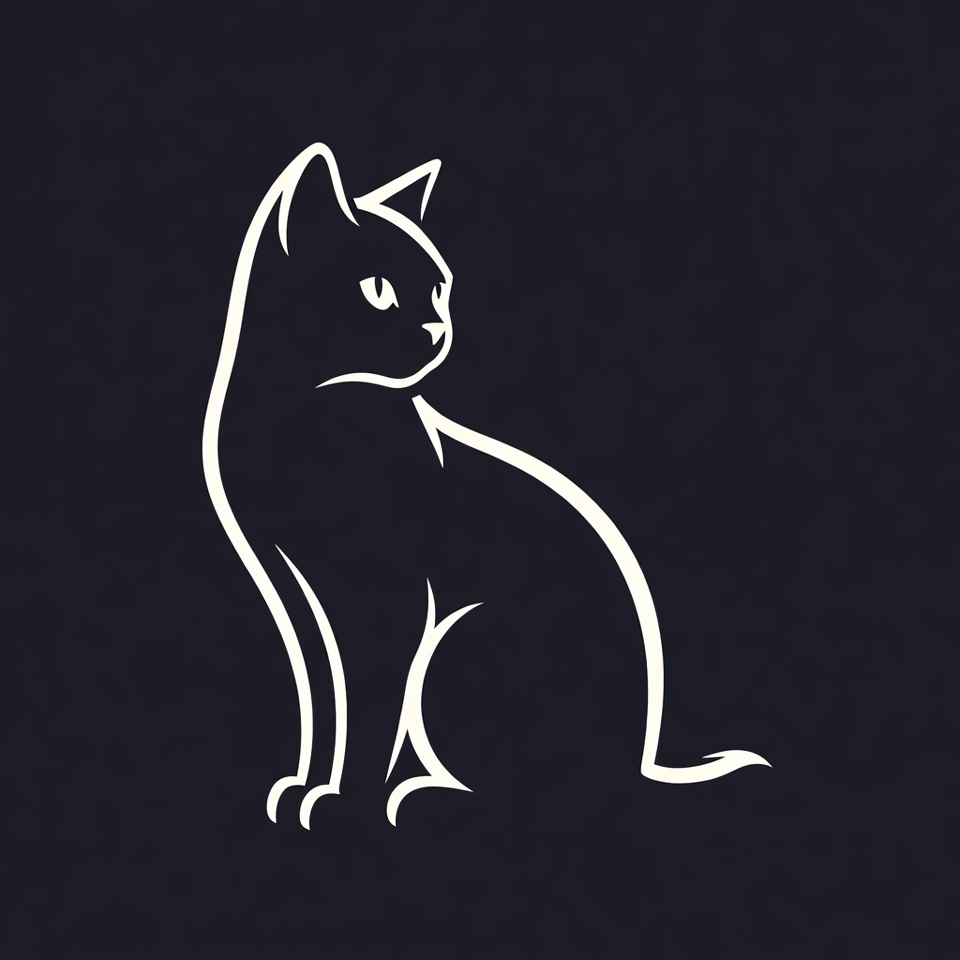 A minimalist white line art silhouette of a cat sits facing right on a solid black background. The cat has a sleek outline with pointed ears, alert eyes, and a curved tail. The illustration features clean, simple strokes emphasizing the cat's profile.