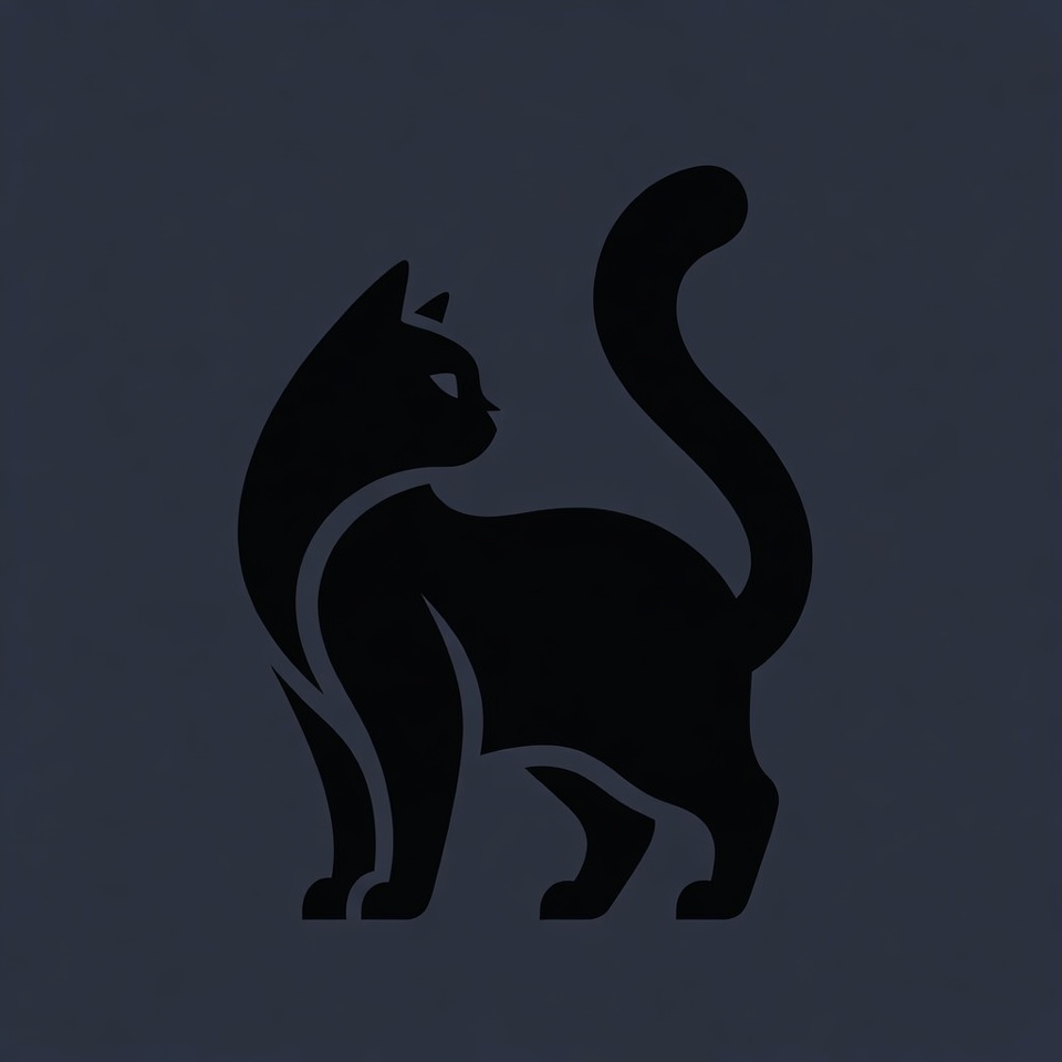 A minimalist black silhouette of a cat stands in profile against a dark blue background. The illustration features smooth outlines highlighting the cat's pointed ears, arched back, bushy tail, and sturdy legs. It has a simple, elegant design with subtle white highlights along the contours.