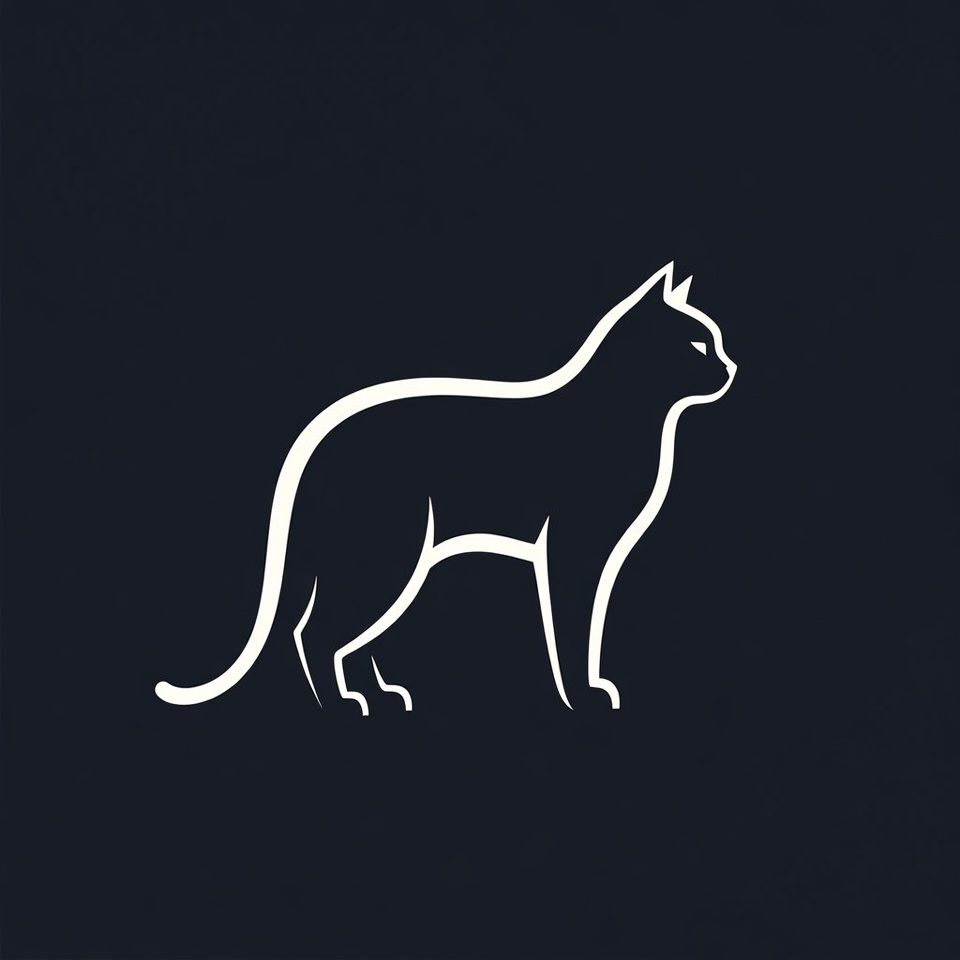 A minimalist white line drawing of a cat in profile against a dark background. The cat stands with arched back, pointed ears, and a long curved tail. The isolated illustration features clean outlines and no internal details.