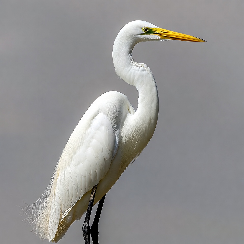 A majestic white heron stands tall with its long neck curved gracefully. It features bright green eyes, a striking yellow bill, and black legs against a plain gray background. The feathers are detailed and fluffy, especially around the tail.