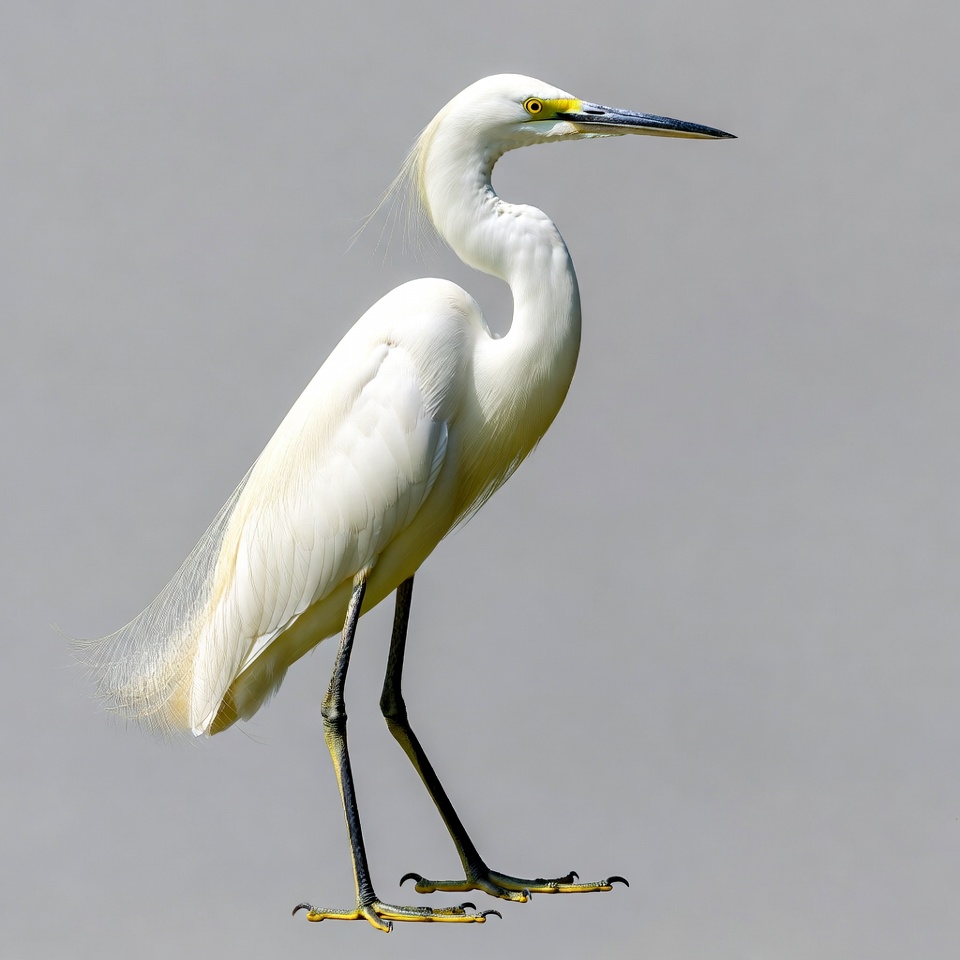 avian, bird, black beak, egret, feathers, gray background, isolated background, long neck, nature, standing, wading bird, white heron, wildlife, yellow legs, yellow lores, snowy egret