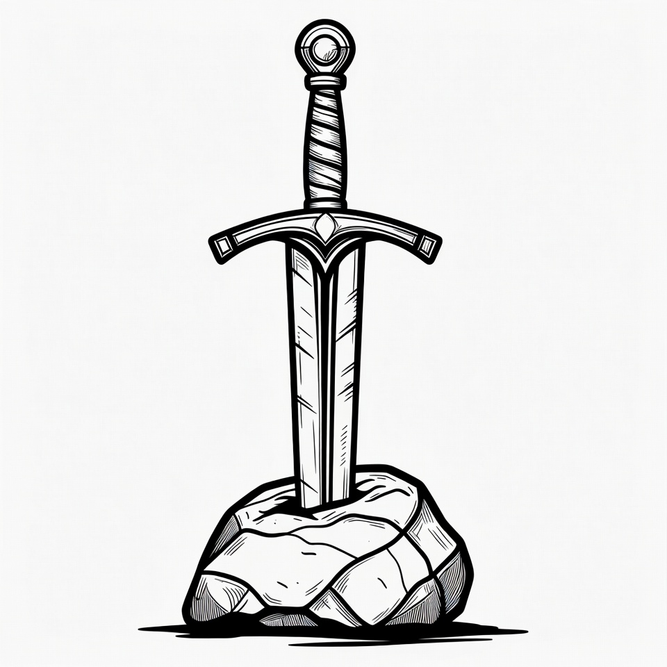 Excalibur, black and white, blade, clipart, crossguard, fantasy weapon, grip, illustration, ink drawing, isolated background, knight sword, line art, medieval sword, pommel, rock, stone, sword in stone, vector art, sword