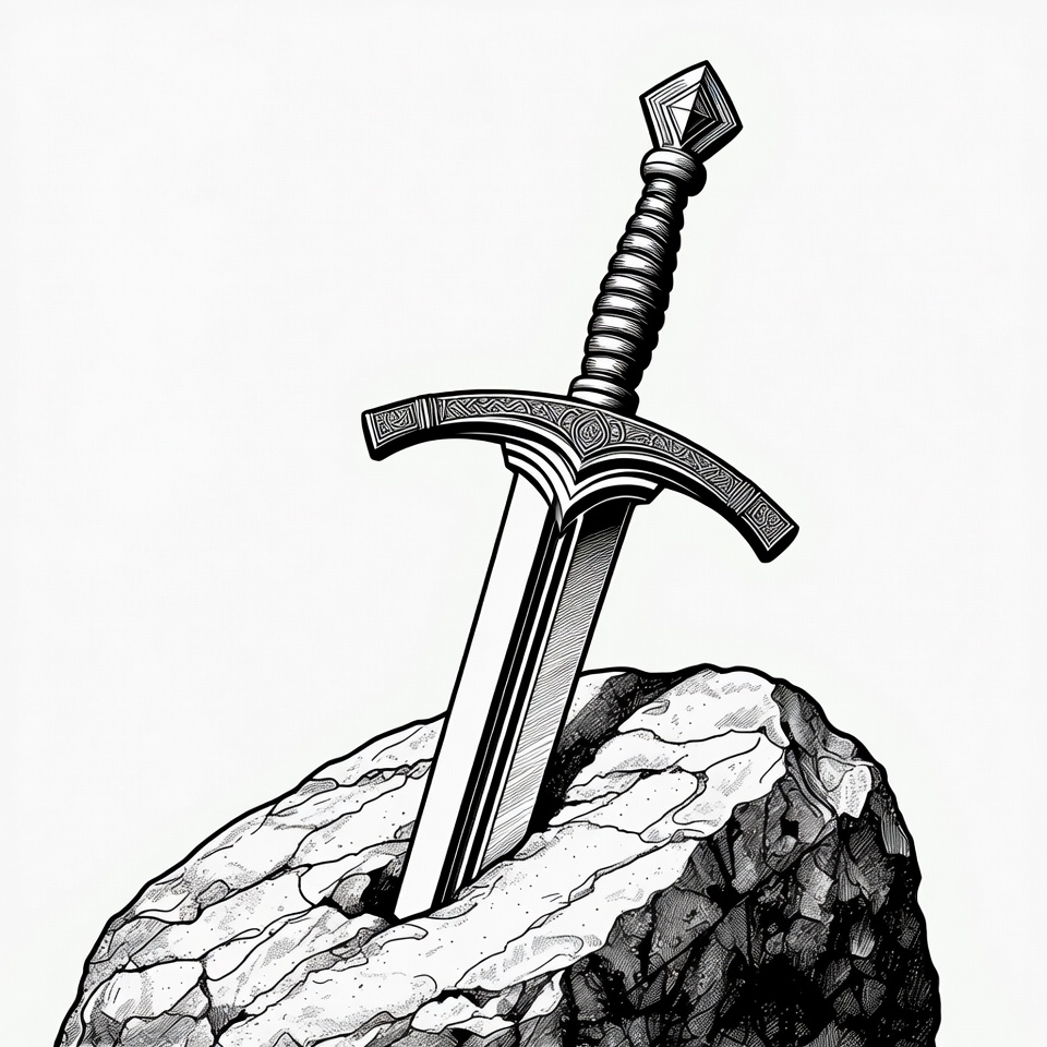 Arthurian, Excalibur, black and white, blade, clipart, crossguard, fantasy, grip, illustration, isolated background, knight, line art, medieval sword, pommel, rock, sharp blade, stone, sword in stone, weapon, sword