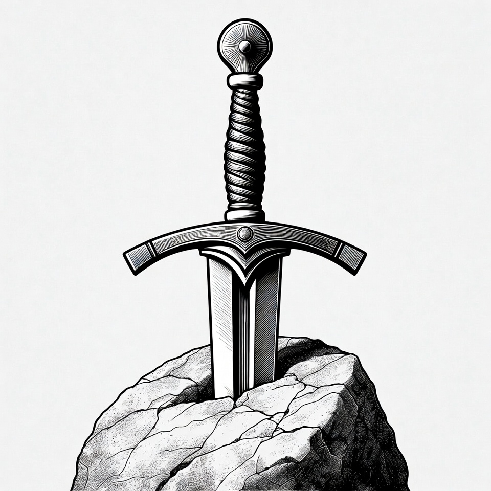 A detailed black and white illustration depicts a medieval sword embedded in a rugged stone. The sword features a twisted grip, ornate crossguard, and pointed blade. It stands vertically on an isolated white background.
