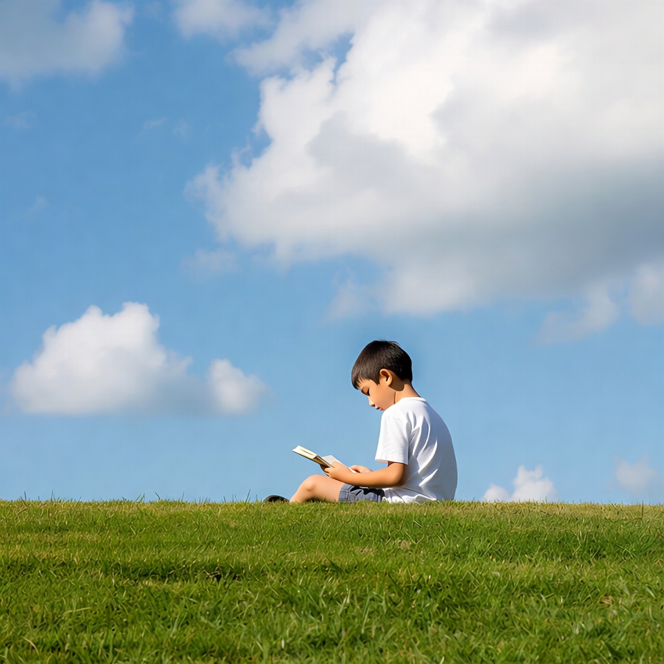A young Asian boy with short black hair sits on green grass reading an open book. He wears a white t-shirt and blue shorts, with a bright blue sky and fluffy white clouds in the background. The boy is positioned sideways, focused on the pages.