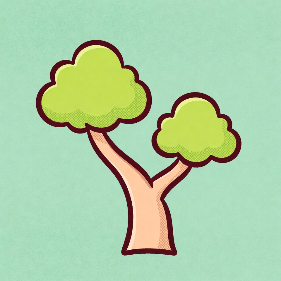A vibrant cartoon illustration features a single green tree with a brown trunk and curved branches on a light green background. The tree has a rounded canopy with halftone dot texture and thick black outlines. It stands isolated against the solid background.