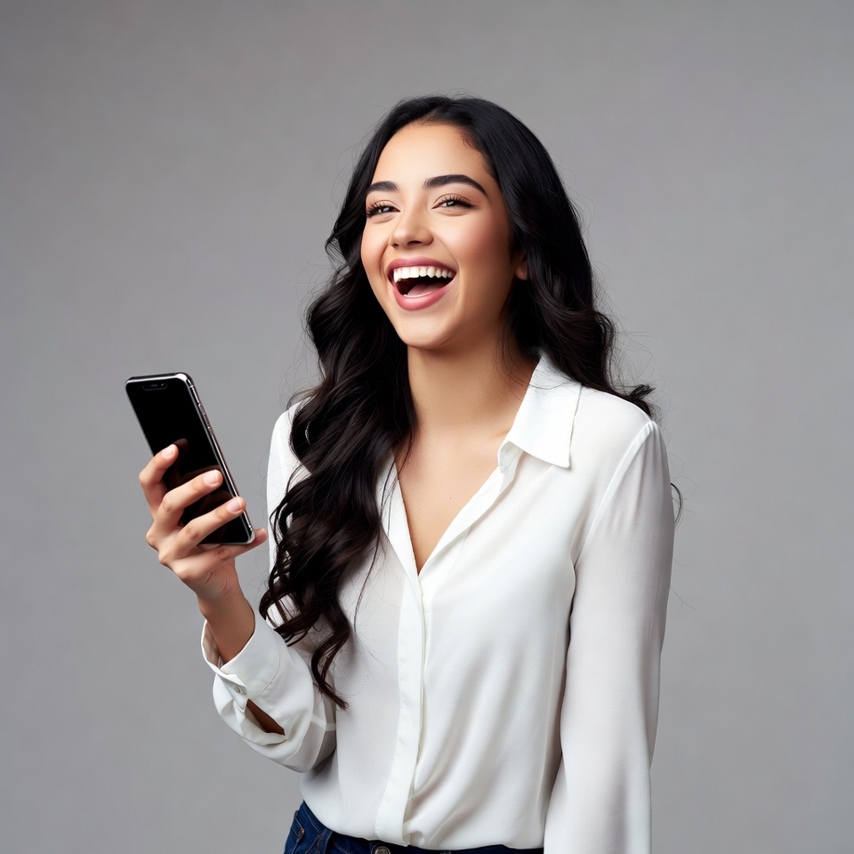 A young woman with long wavy dark hair smiles widely while laughing at her smartphone. She wears a white collared blouse and blue jeans, holding the black phone in her right hand. She stands against a plain gray background.