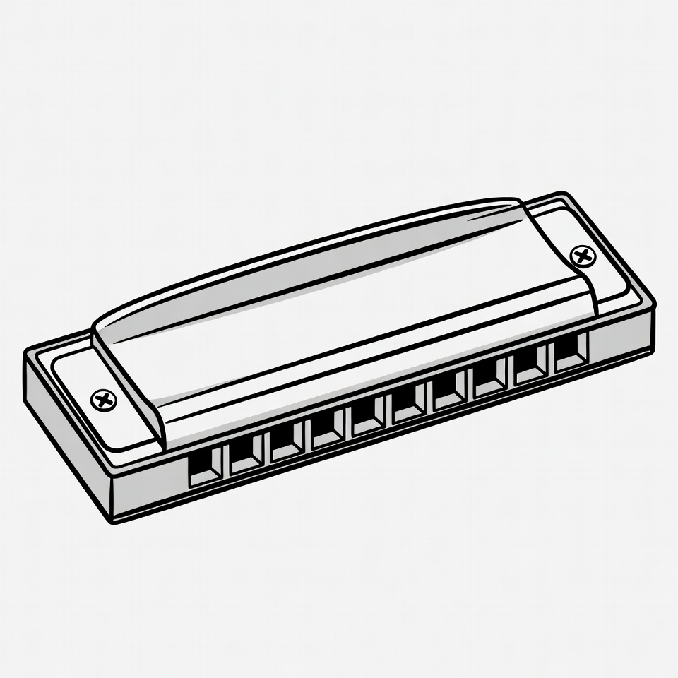 air holes, blues harp, clipart, illustration, isolated background, line drawing, metal screws, mouth organ, musical instrument, side view, vector art, harmonica