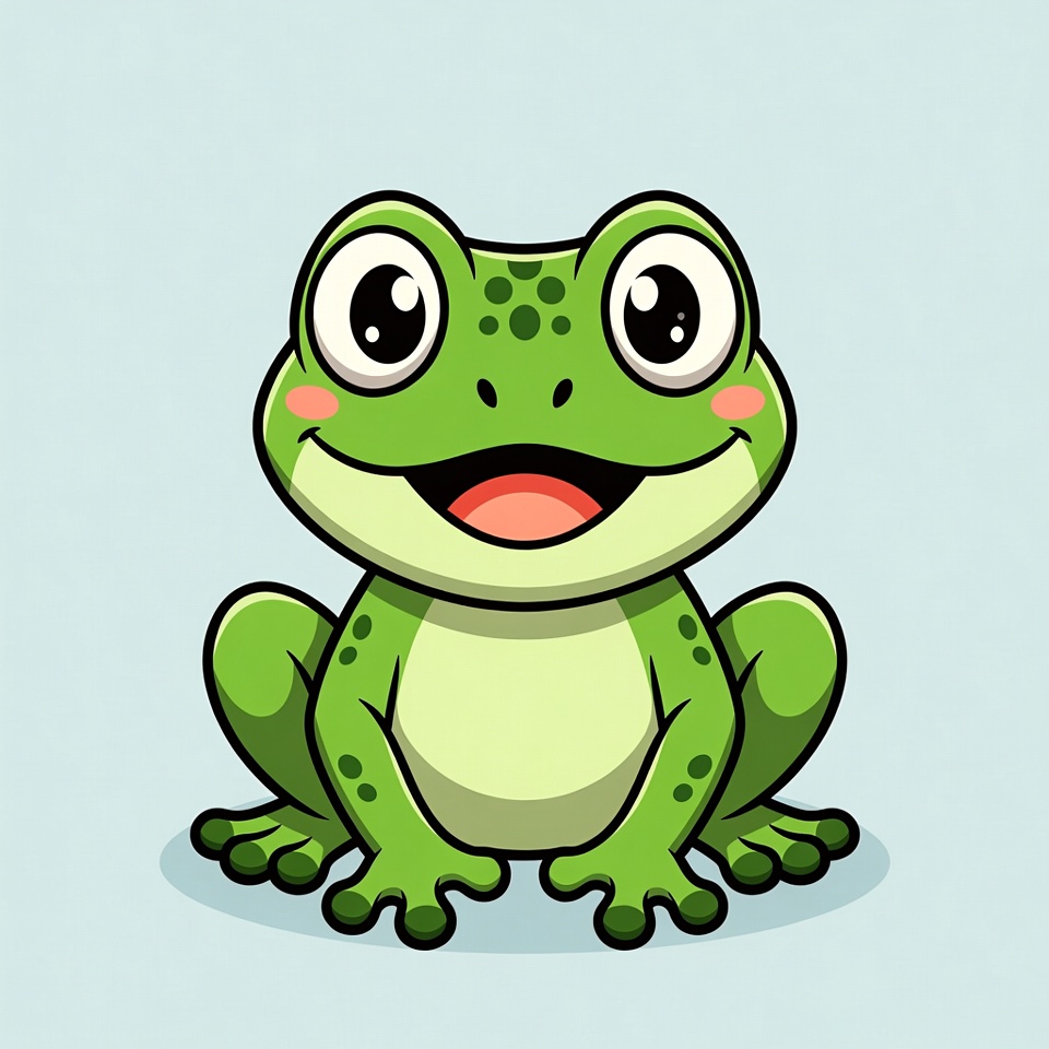 A vibrant cartoon frog with big sparkling eyes and a wide smile sits on a light blue isolated background. It features green skin with darker spots, rosy cheeks, and a white belly. The frog's legs are tucked under its body in a playful pose.