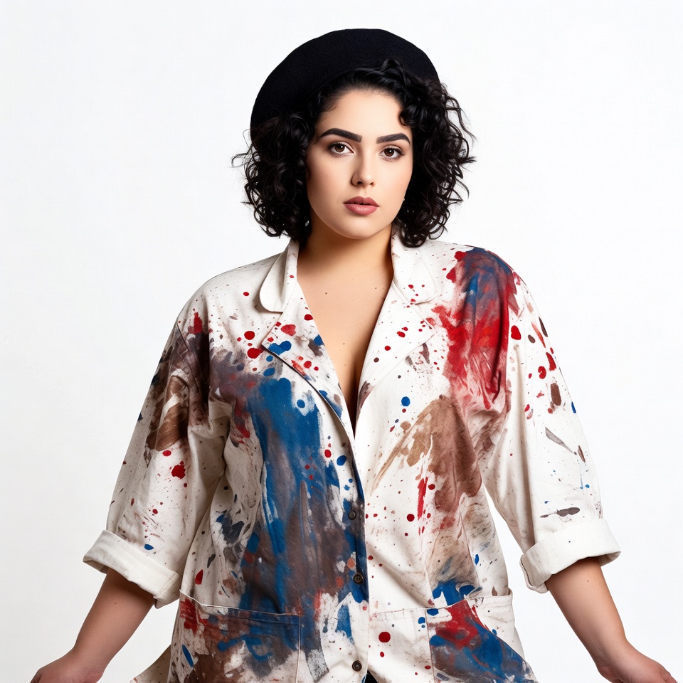 A woman with curly dark hair wears a black beret and stands against a white background. She has a neutral expression and is dressed in a white blazer covered in colorful paint splatters of blue, red, and brown. The jacket is open at the front with rolled-up sleeves.