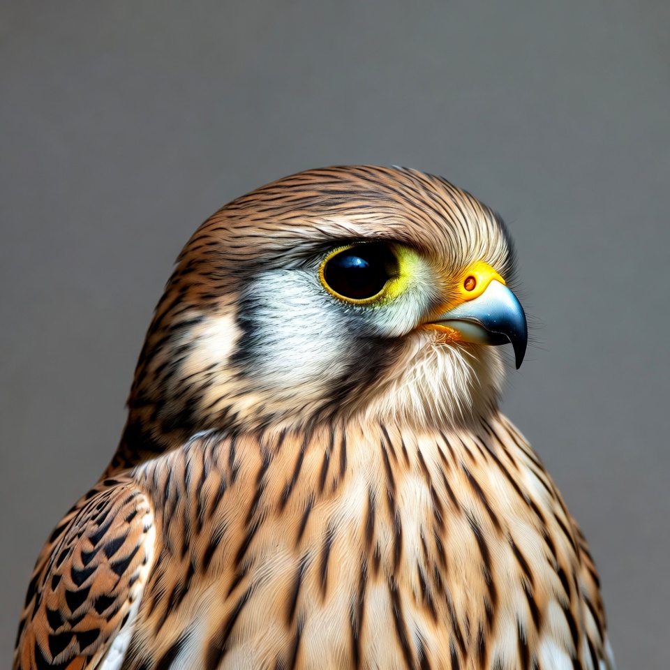 beak, bird, birdwatching, black barring, brown feathers, close-up, eye, falcon, feathers, gray background, isolated background, kestrel, portrait, raptor, tan plumage, white face, wildlife, yellow beak, yellow eye, American kestrel