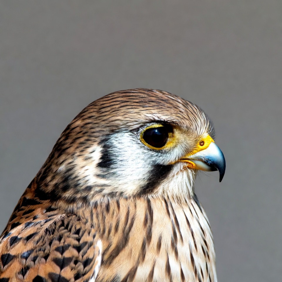 bird, bird of prey, bird portrait, brown feathers, close-up, detailed feathers, falcon, feathers, gray background, kestrel, perched bird, profile view, raptor, sharp eyes, tan feathers, wildlife, wildlife photography, yellow beak, yellow eyes, American kestrel