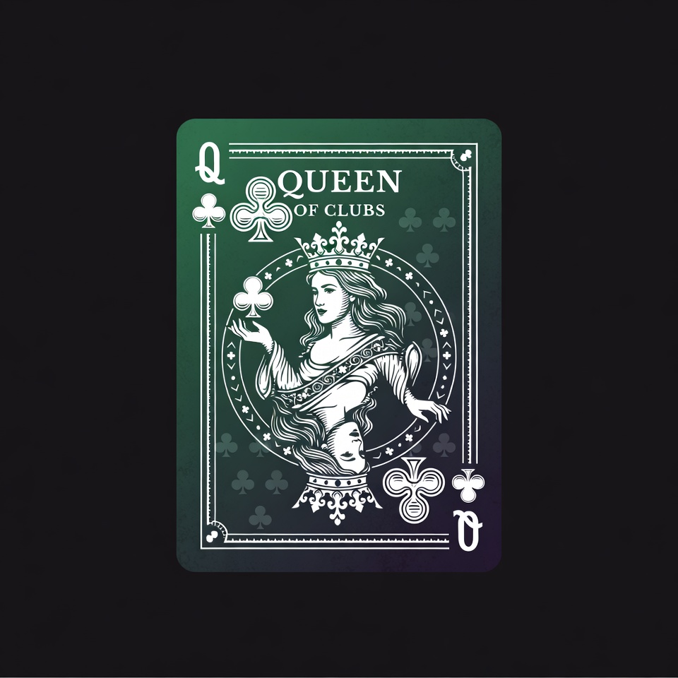 An illustrated Queen of Clubs playing card features a regal woman with long flowing hair holding a clover leaf. She wears an elegant gown and is depicted with symmetrical faces in a classic card design. The card has a green and black gradient background adorned with multiple clover symbols.