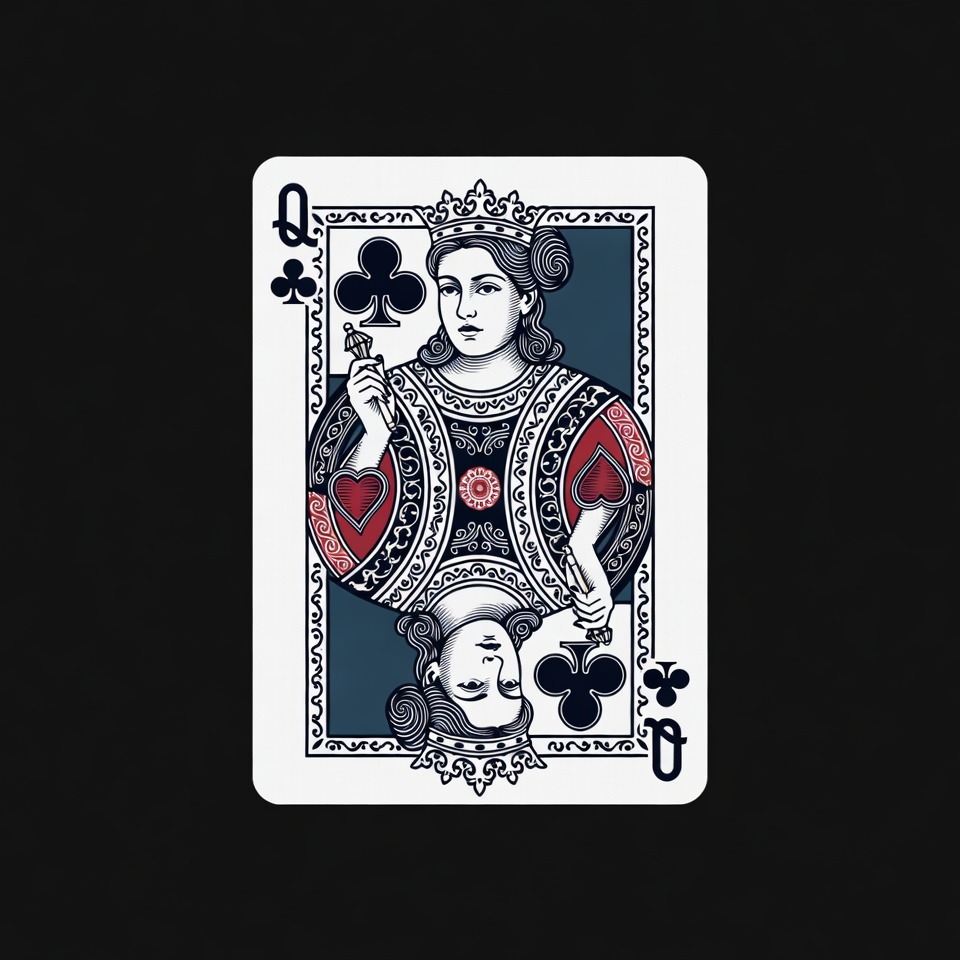 A detailed illustration of the Queen of Clubs playing card features a regal woman with a crown holding a scepter. She wears an ornate black and red gown with intricate gold patterns and clubs symbols. The card displays 'Q' and three black clubs on a white background with blue borders.