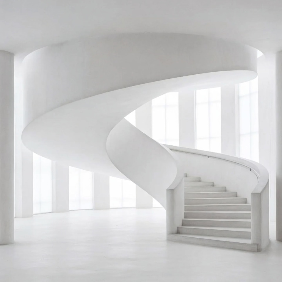 A sleek white spiral staircase winds upward in a minimalist white interior. Tall vertical windows line one side, allowing soft light to illuminate the empty space. Smooth white columns frame the architectural structure against a polished white floor.
