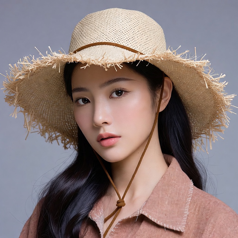 A young Asian woman with long straight black hair smiles softly at the camera. She wears a wide-brimmed beige straw hat with fringed edges and a brown leather strap. She is dressed in a light brown collared shirt against a plain gray background.