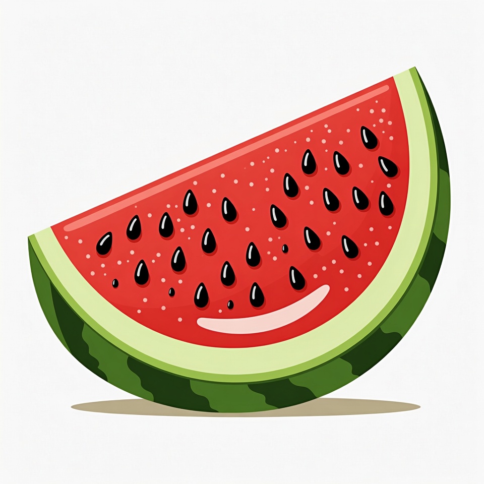A vibrant cartoon slice of watermelon features juicy red flesh dotted with black seeds and a pale green rind. The illustration is set against a white background with a subtle shadow for depth. It has a cheerful, smiling expression on the fruit.