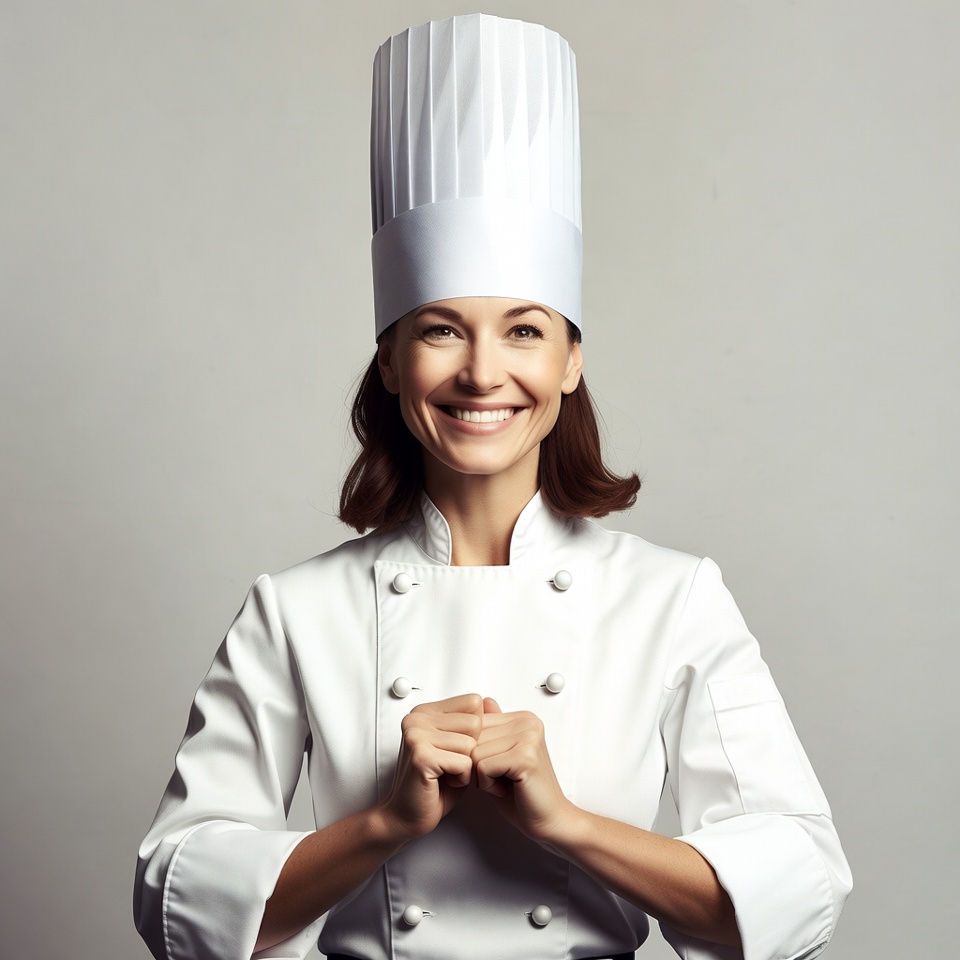 White, brown hair, chef, chef uniform, cook, female, green eyes, hands clasped, happy woman, isolated background, kitchen chef, portrait, professional chef, smiling, studio portrait, white chef hat, white jacket, woman