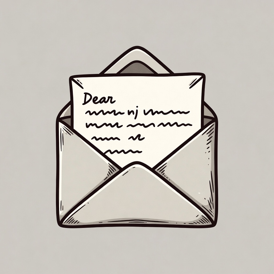 A hand-drawn illustration of a beige open envelope on a gray background. Inside the envelope is a white letter with handwritten text starting with 'Dear'. The envelope features simple line art style with visible folds and flaps.