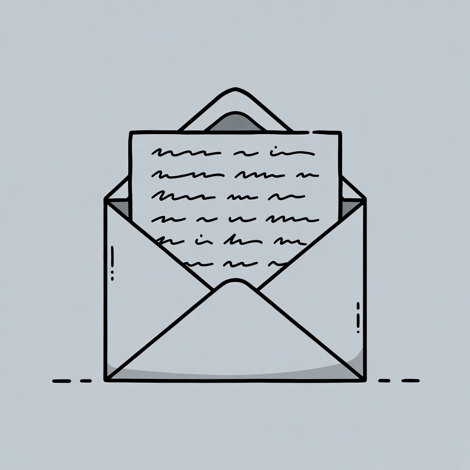 A simple line drawing illustration shows an open white envelope with a folded letter inside. The letter features handwritten scribbles in black ink. The image is presented on a light gray background.