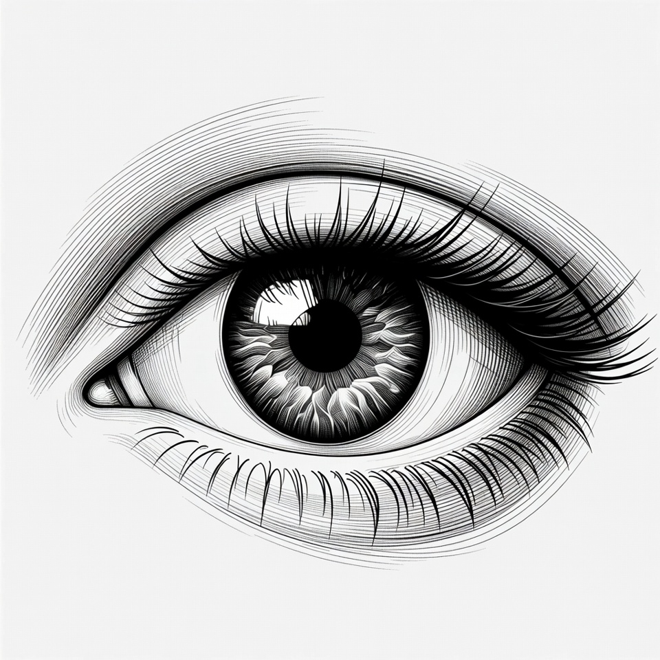 anatomy, artistic, black and white, closeup, detailed, drawing, eyelashes, human eye, illustration, ink art, iris, isolated background, line art, monochrome, pupil, realistic, reflection, shaded, sketch, eye