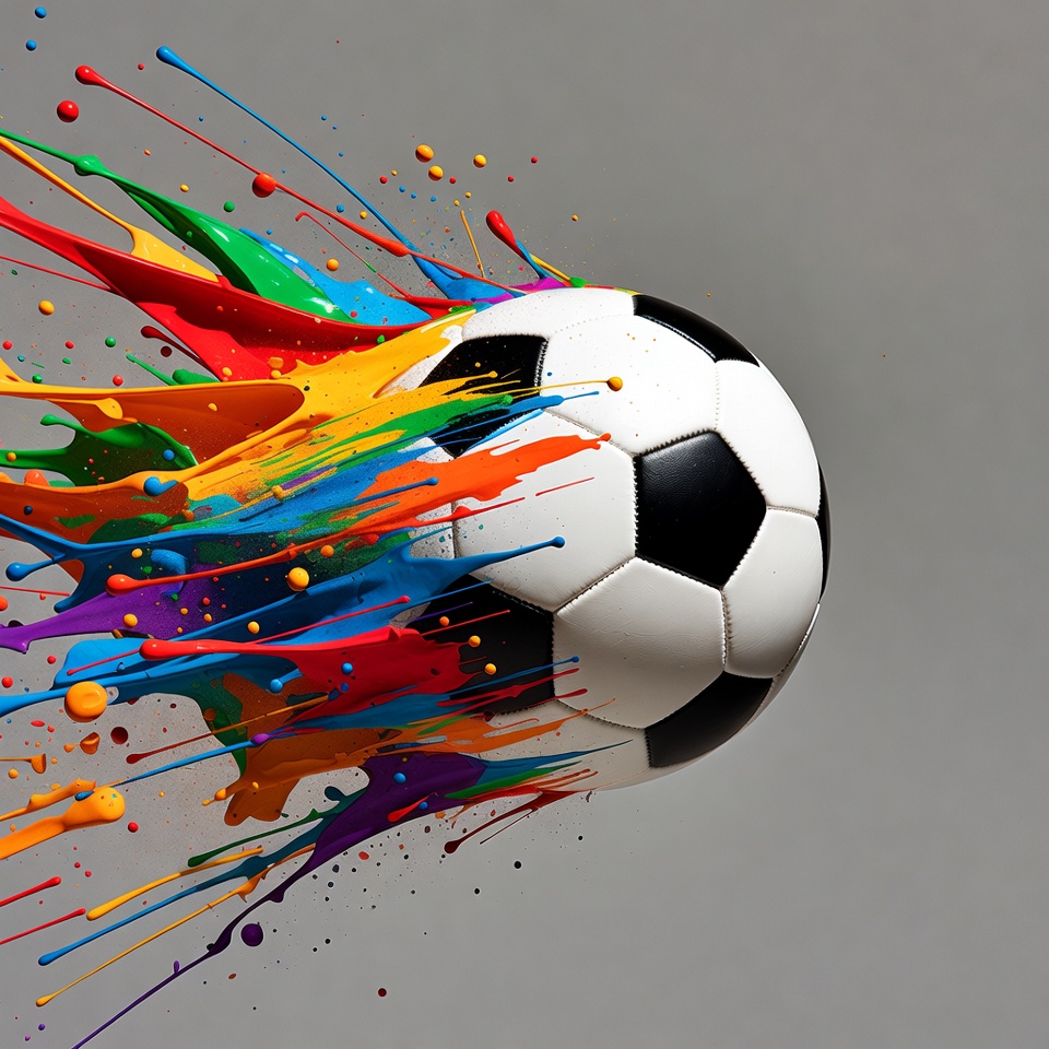 A white soccer ball with black pentagons is centered against a gray background. Vibrant multicolored paint splashes in red, blue, green, yellow, and orange explode dynamically around and behind the ball. The paint creates a sense of motion and energy.
