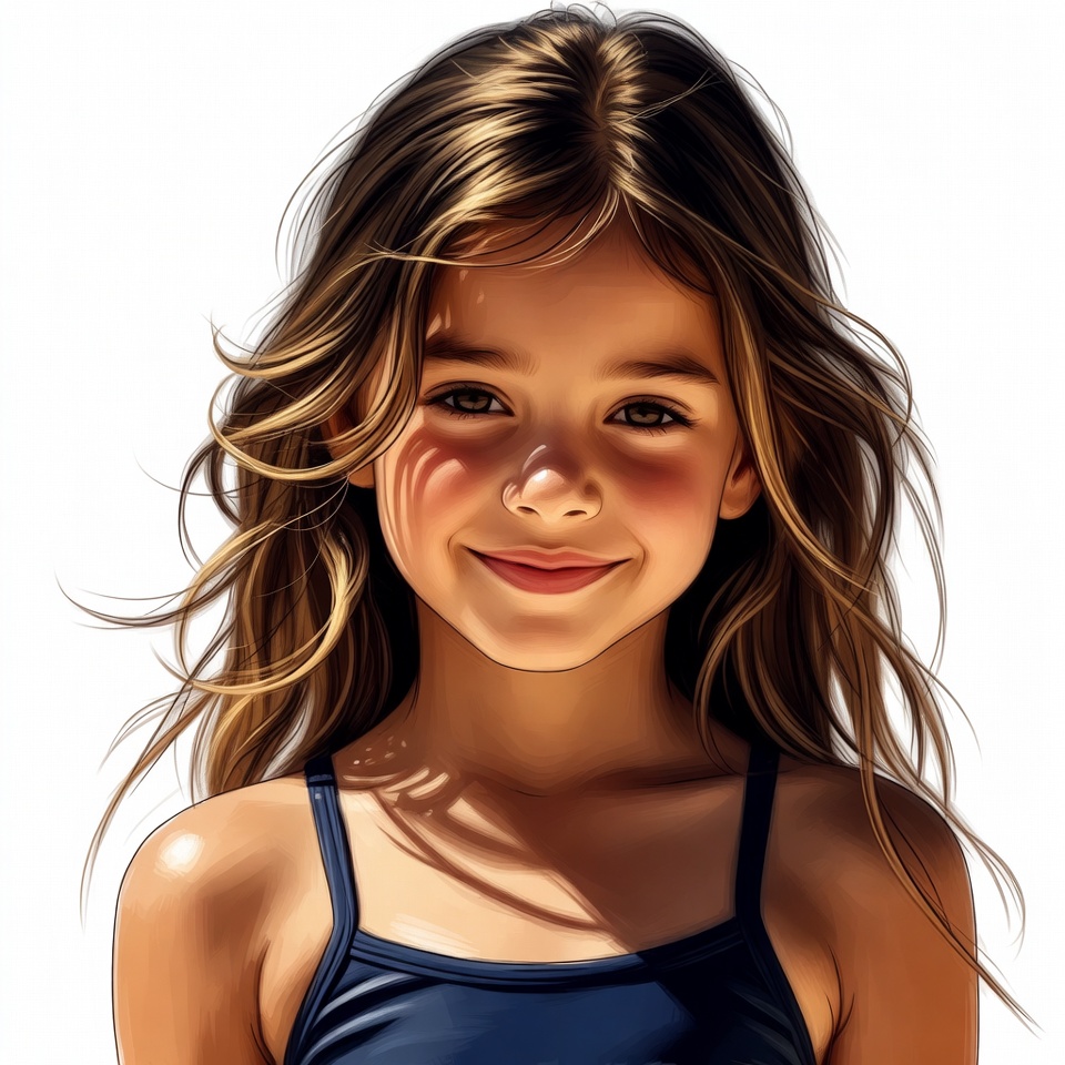 A young girl with long wavy brown hair smiles happily at the viewer. She wears a blue spaghetti-strap swimsuit and stands against a white background. Sunlight highlights her face and shoulders in this digital illustration.