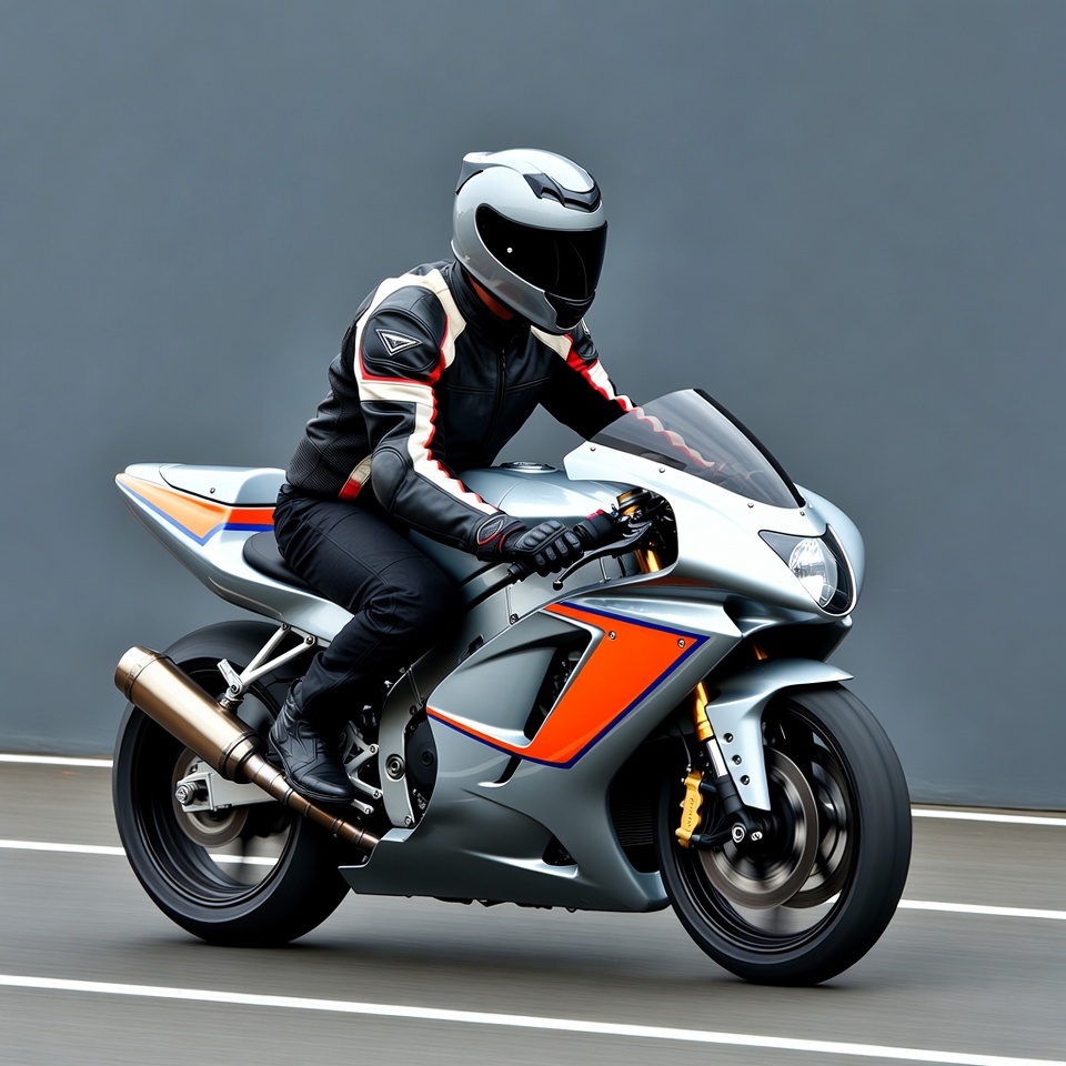 A man wearing a full-face helmet, white leather jacket with red stripes, black pants, and gloves rides a silver sport motorcycle with orange accents. The bike features a sleek design, exhaust pipe, and yellow accents on a gray background. He leans forward in a dynamic riding pose on a track.