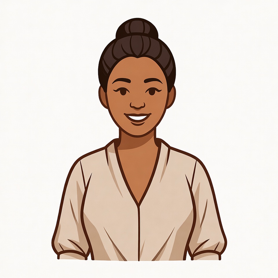 A cartoon illustration of an African-American woman with a smiling face and dark hair styled in a neat bun. She wears a light beige v-neck blouse with short sleeves. The image features her head and shoulders on a transparent background.