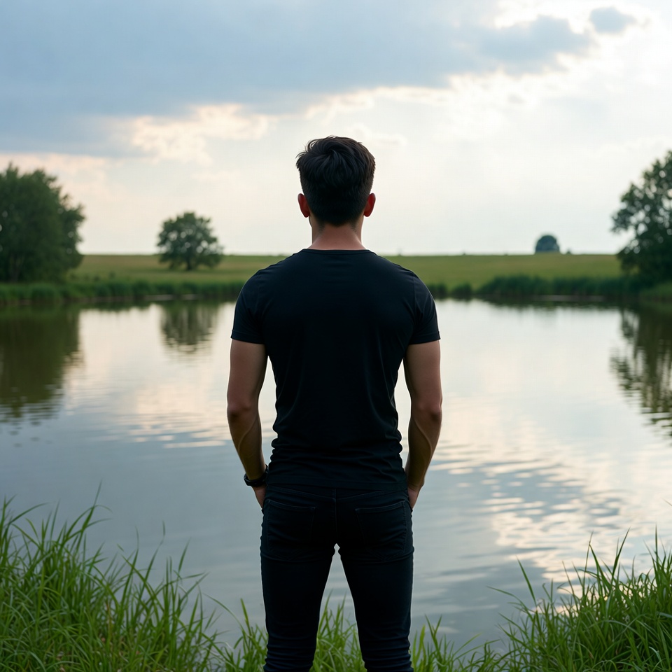 A man with short dark hair stands with his back to the camera, wearing a black t-shirt and black pants. He faces a calm lake surrounded by green fields and trees under a cloudy sunset sky. Tall grass frames the foreground near the water's edge.