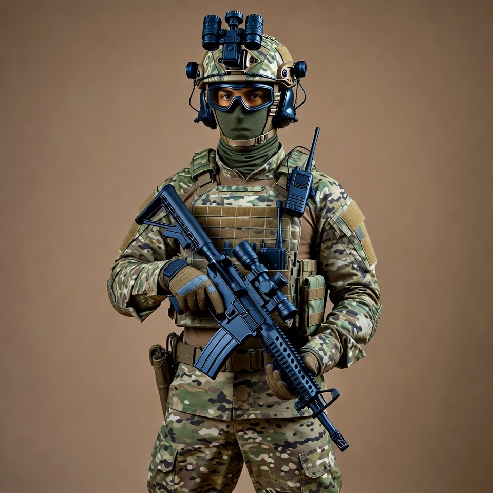 A soldier in full camouflage uniform stands against a plain background, holding a black assault rifle across his chest. He wears a tactical helmet with night vision goggles, a green balaclava covering his face, and green gloves. His gear includes a plate carrier vest with pouches and a radio antenna.