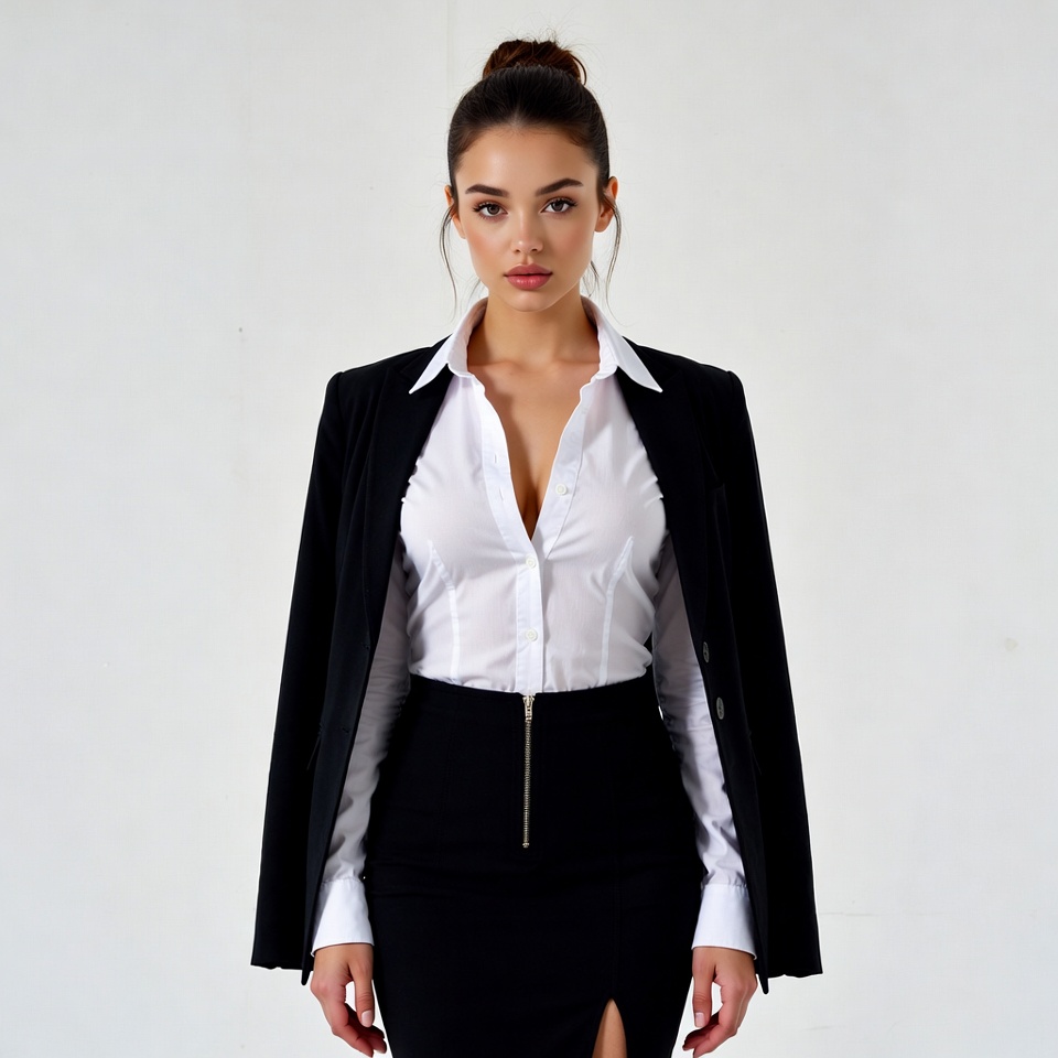 A young woman with dark hair in a bun stands confidently against a white background. She wears a black blazer over a white collared blouse with a deep V-neck and a tight black skirt featuring a front zipper and side slit. Her arms are at her sides in a professional pose.