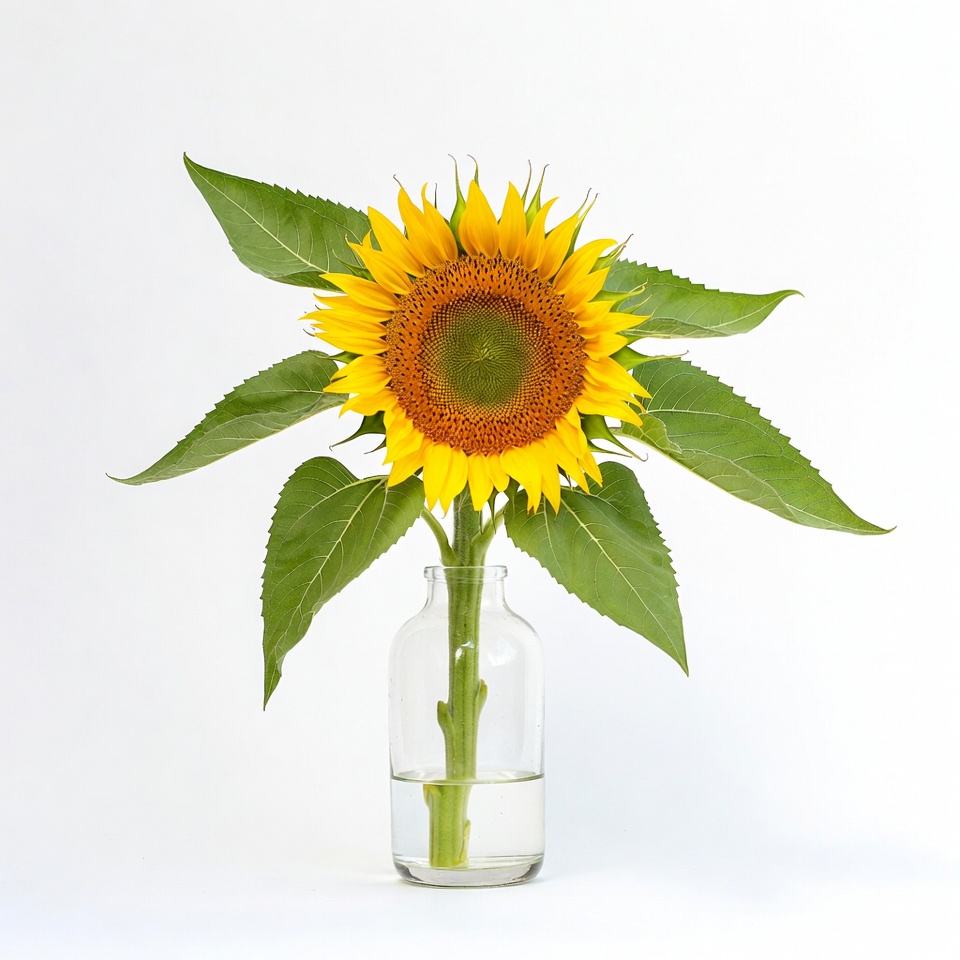 bloom, bright yellow, clear vase, floral, flower, fresh sunflower, glass vase, green leaves, isolated, large flower, nature, plant, stem, water, white background, yellow petals, sunflower